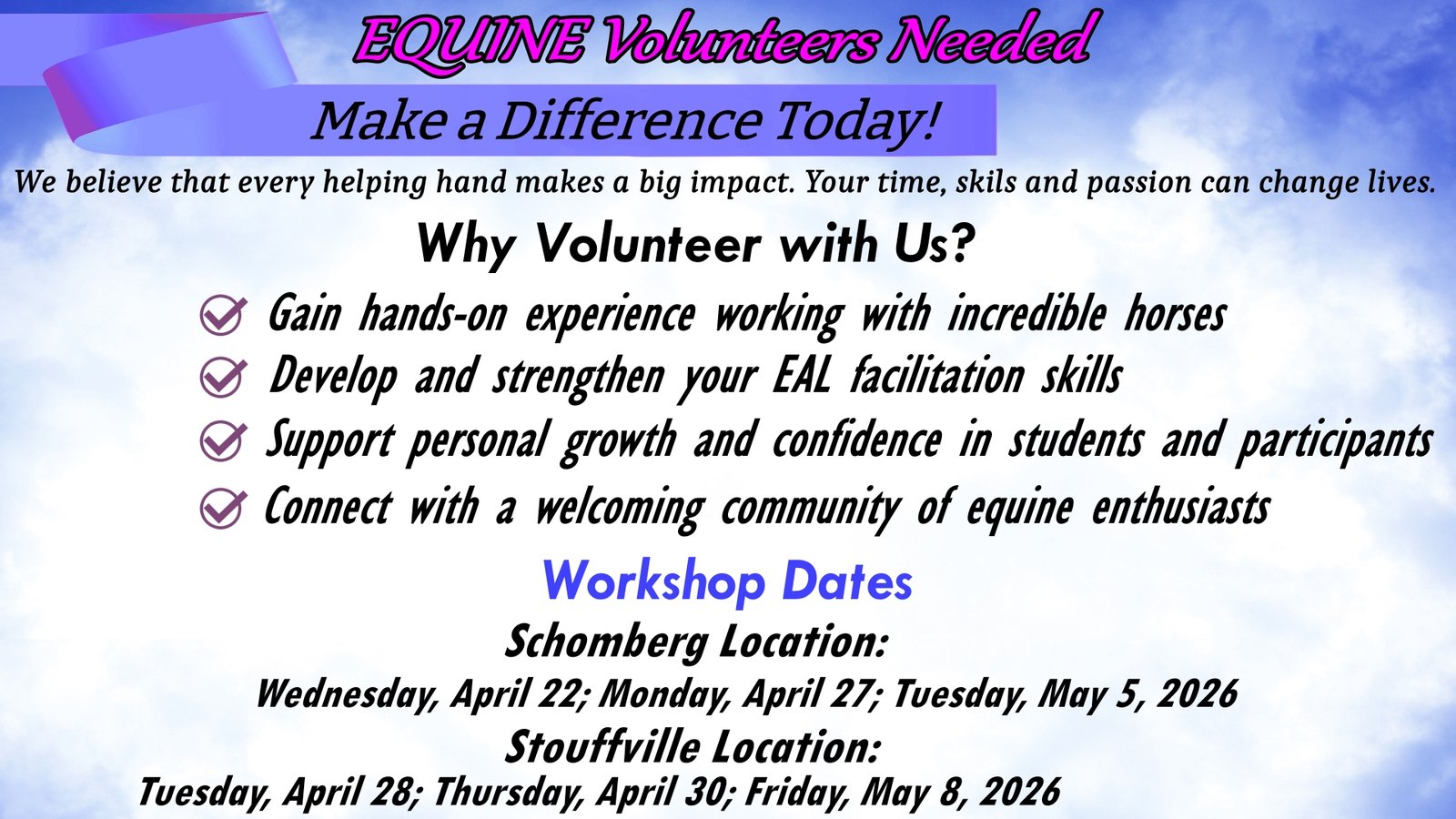 Sign UpInterested in Equine Assisted Learning. Please fill out the Volunteer Form to get started. Please enable JavaScript in your browser to complete this form.Name *FirstLastEmail * or Comments Phone Phone Number *Which Location would you like to volunteer? *SchombergStouffvilleAre you available from 9:30am - 2:30pm? *YesNoAre you *select oneCertified in Equine Assisted LearningCertified in Equine Assisted Therapyan Equine studentI would like to receive email updates regarding future EAL eventsComments or QuestionsSubmit